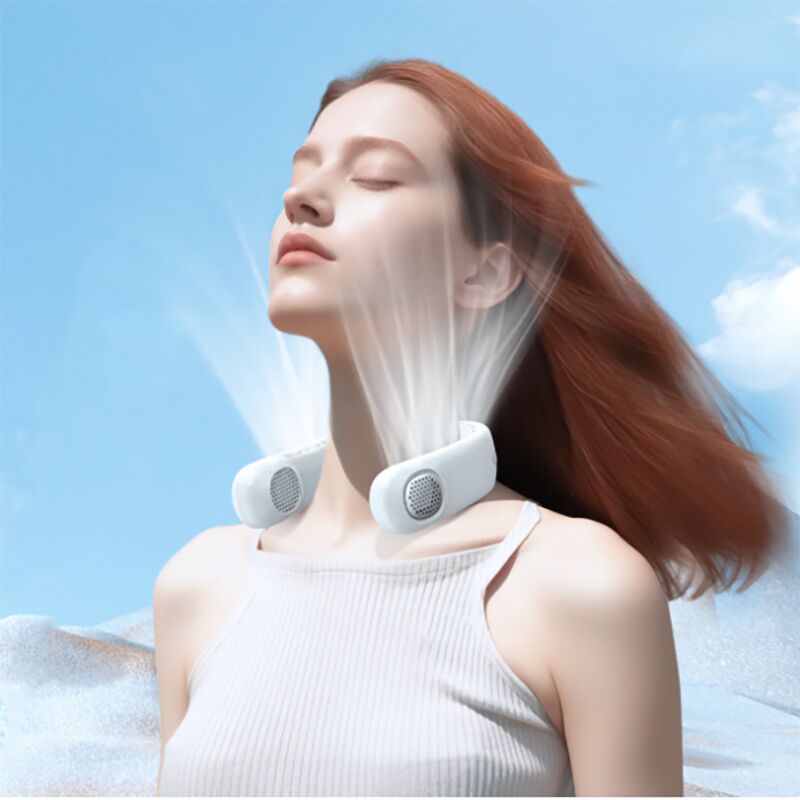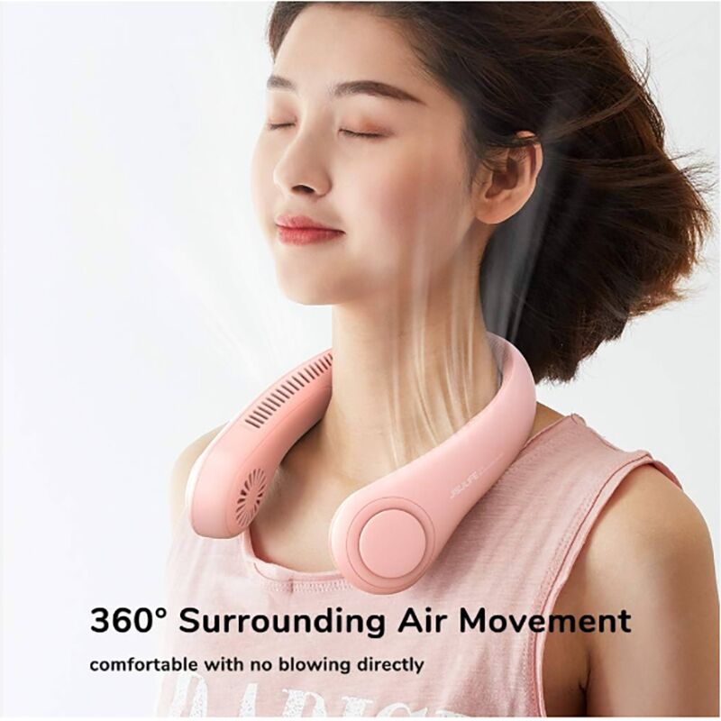 This portable neck fan is designed to be worn comfortably around your neck, keeping your hands free. The ergonomic design ensures the fan stays securely in place and doesn’t cause discomfort, even during extended use.